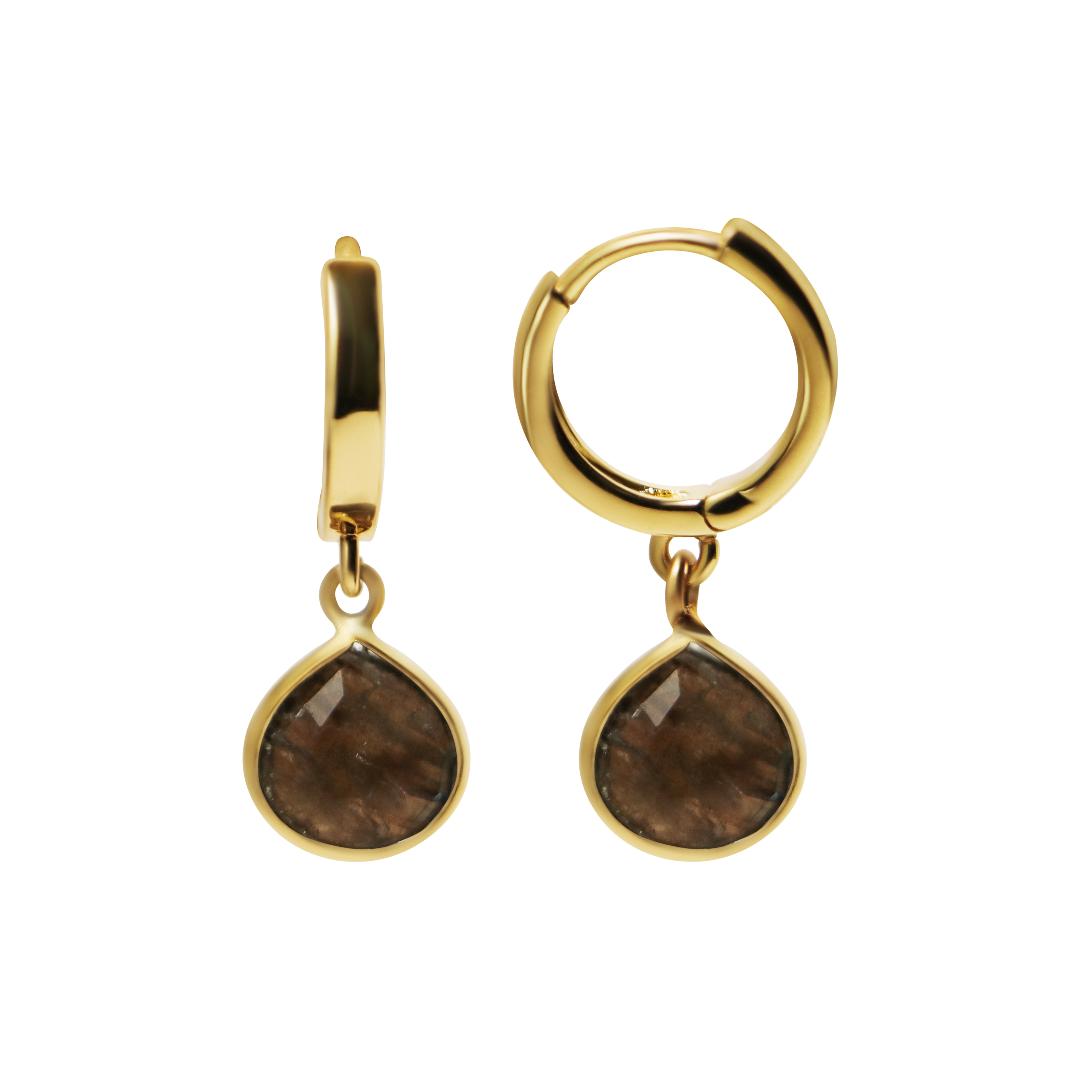 Gold hoops with a single labradorite stone cabochon gracefully dangling, catching the light with every movement. The warm gold tones paired with the iridescent shimmer of the labradorite create a chic, modern, and slightly mystical look that’s perfect for day or night.