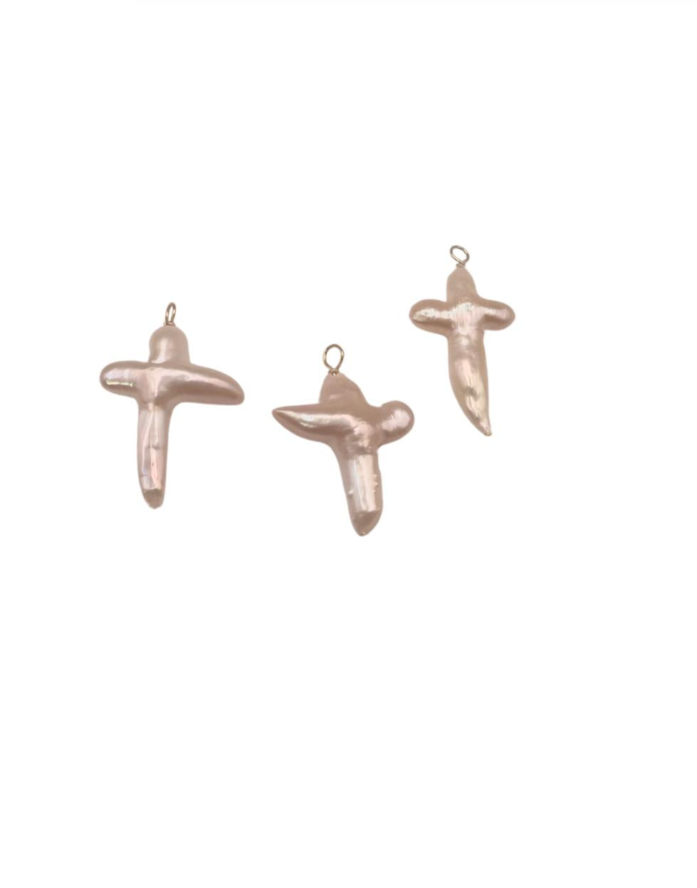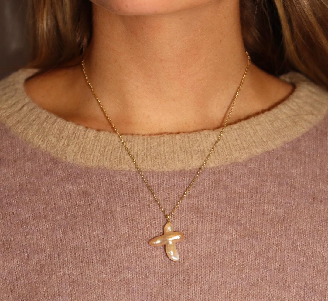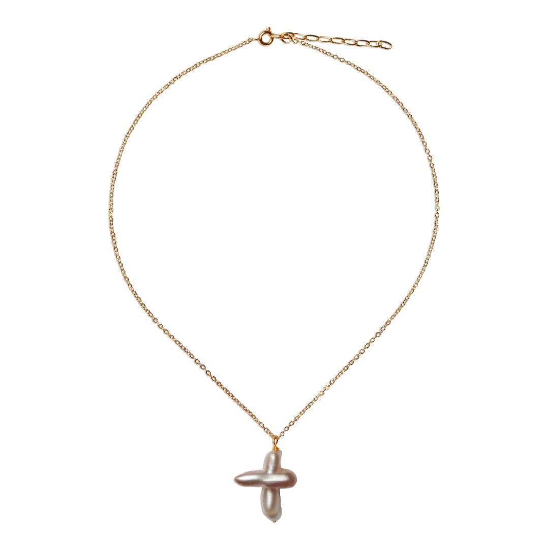 A delicate gold chain paired with a luminous pearl cross pendant. This necklace blends timeless elegance with a modern, minimal feel—perfect for layering or wearing on its own. Each pearl is naturally formed, giving every cross its own subtle variations and unique character.