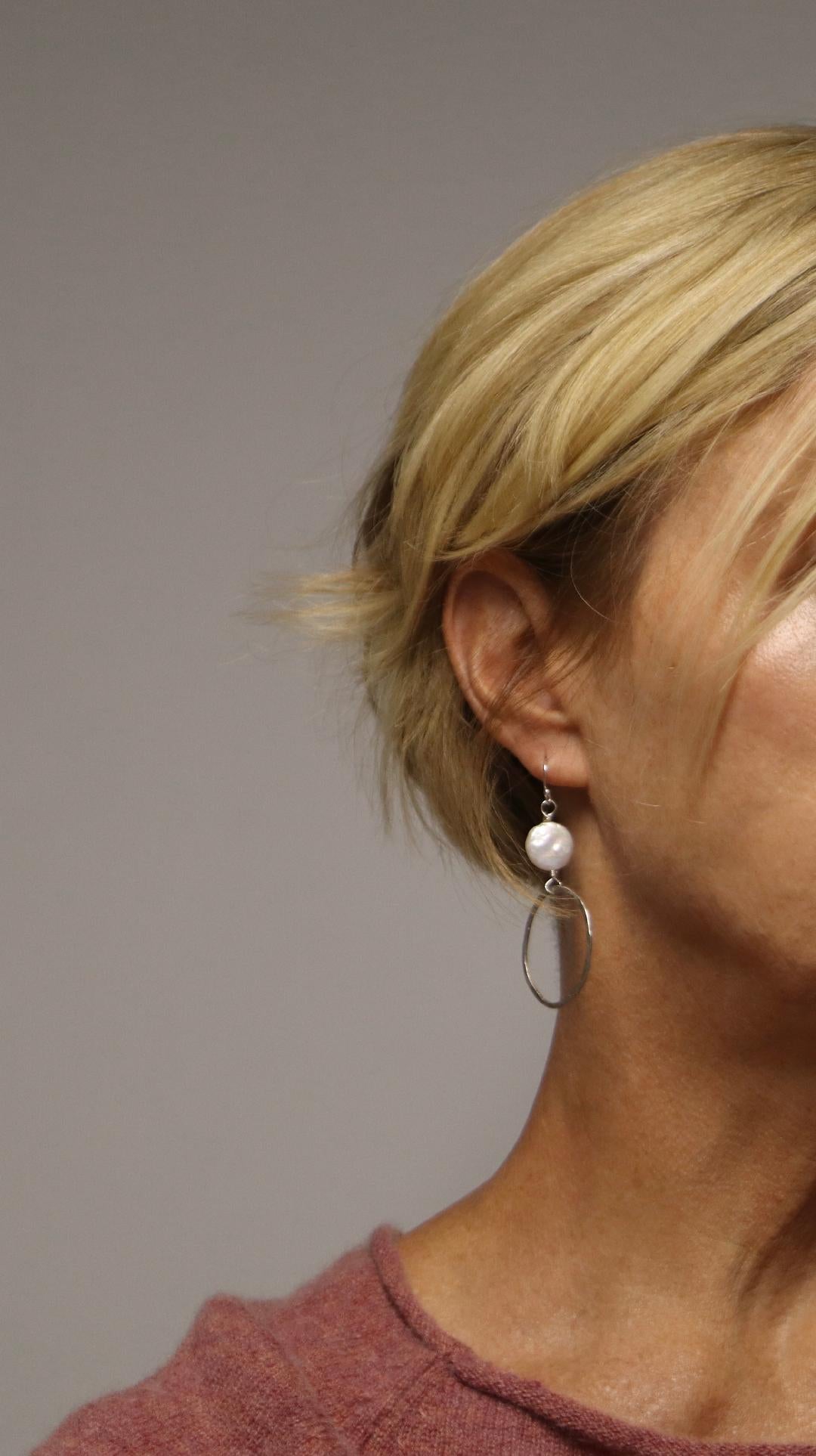 A silver earring featuring a luminous coin pearl that dangles gracefully, with a handmade silver circle suspended below for a modern, artisanal touch. The combination of soft shimmer and unique handcrafted shape creates a playful, eye-catching piece that moves beautifully with every turn.