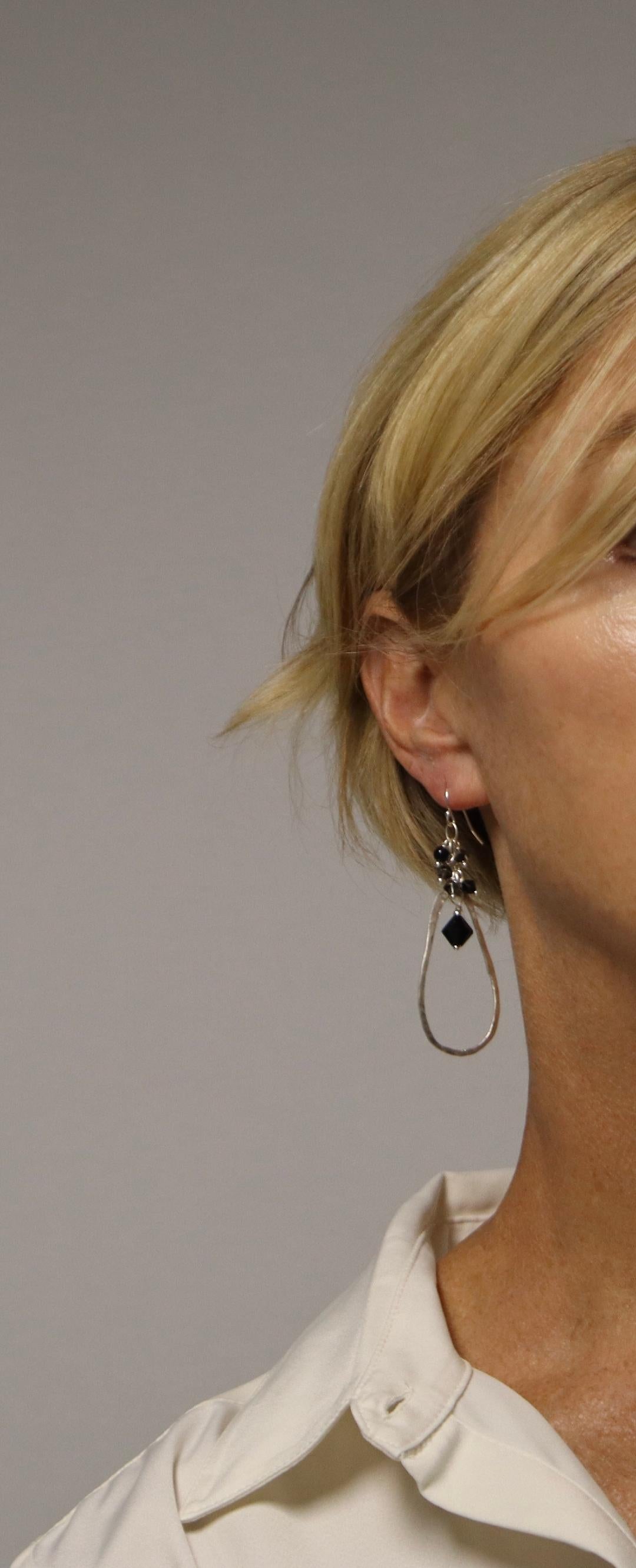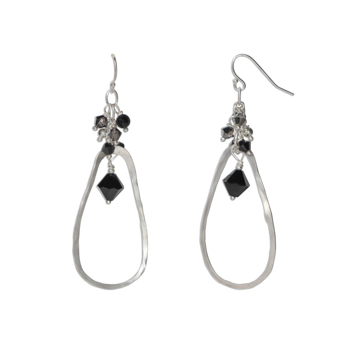 Long silver dangle earrings featuring cascading black Swarovski crystals that shimmer with every movement. The sleek silver setting highlights the dark, faceted stones, creating a dramatic, elegant, and modern statement piece perfect for evening wear or adding a touch of glamour to any outfit.