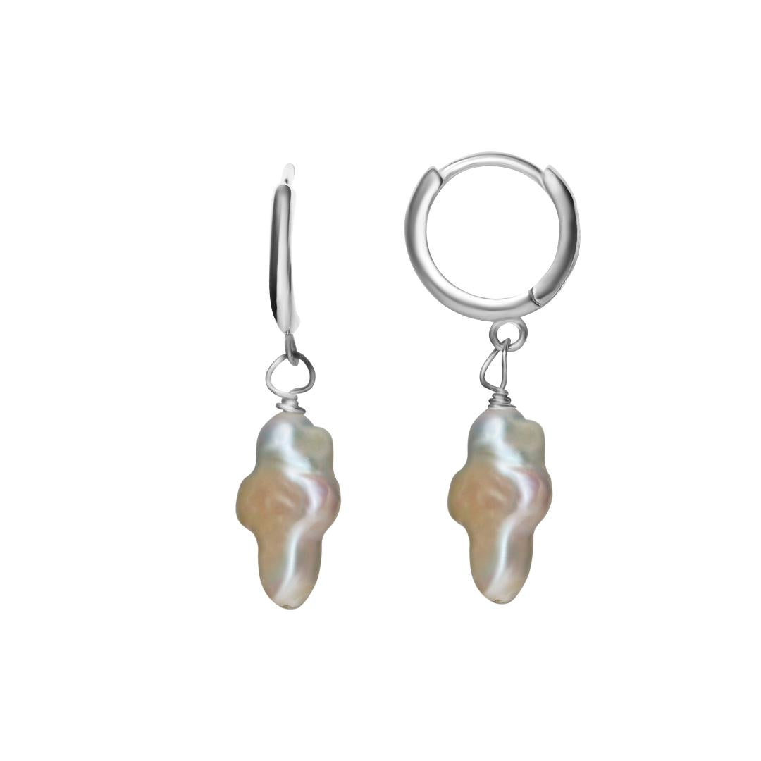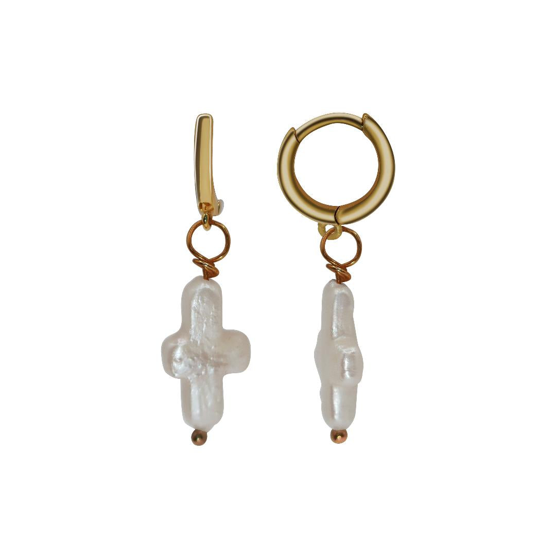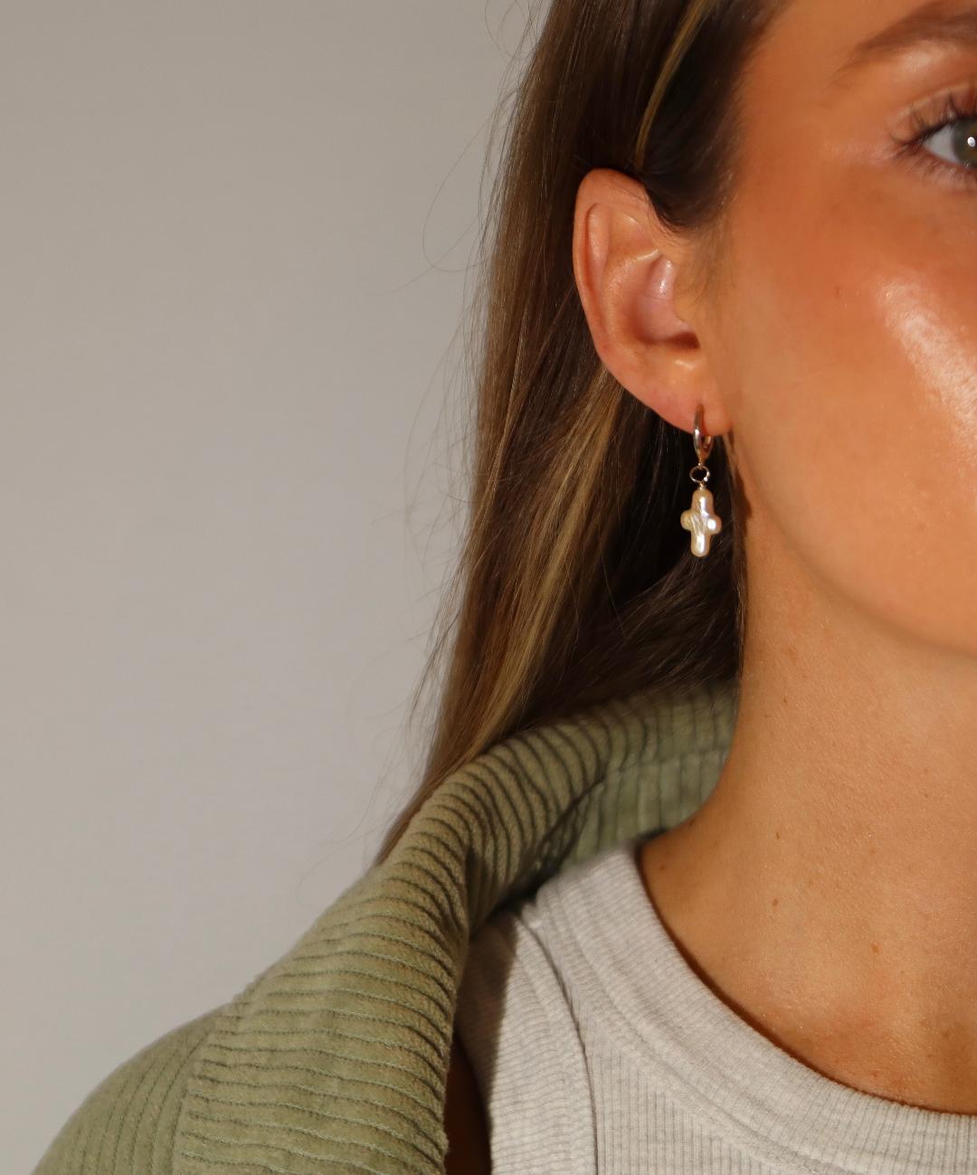 A sweet huggie hoop with a tiny pearl cross that bobs with every movement, adding a touch of charm and personality. Dainty, fun, and effortlessly chic, this little hoop makes a subtle statement with a playful twist.