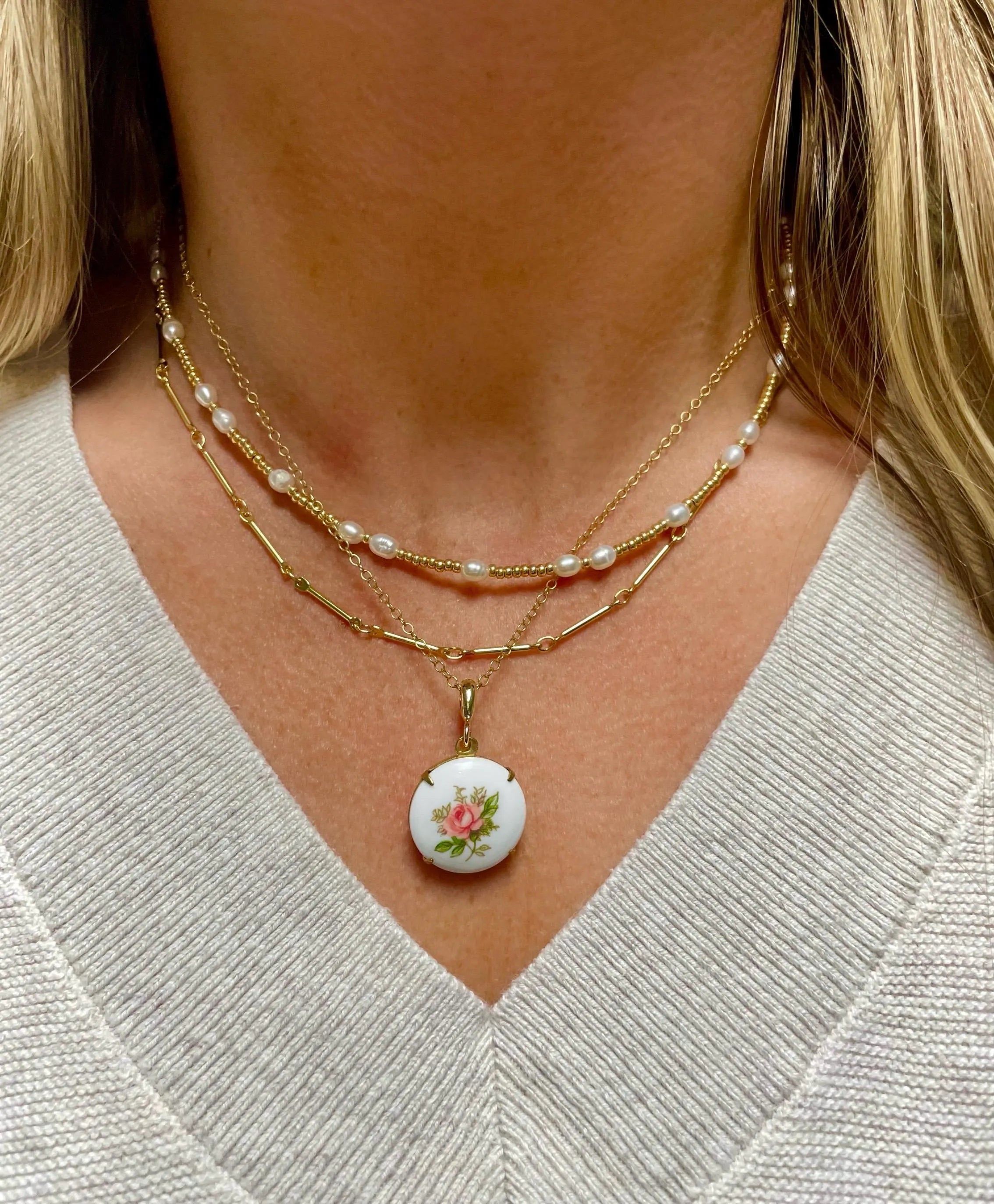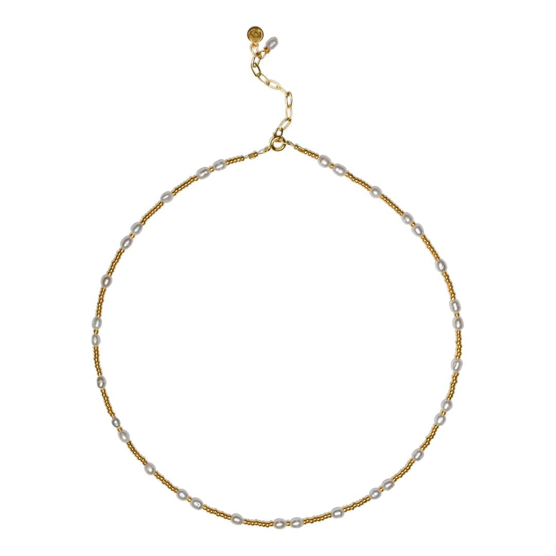 A delicate strand of tiny freshwater pearls paired with shimmering gold-filled seed beads, creating a soft, luminous look that feels both modern and timeless. Lightweight, refined, and effortlessly elegant—perfect for layering or wearing on its own.