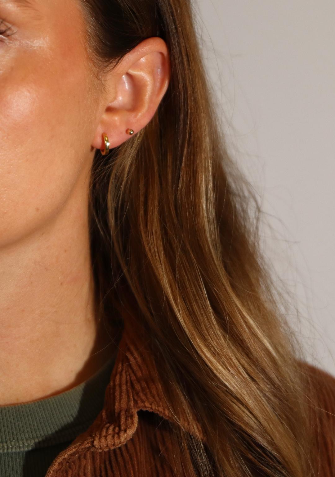 A modern essential, these gold huggie hoops offer effortless sophistication. Designed with a smooth, rounded silhouette, they feature a slightly thicker profile that gives them a sleek, contemporary look while remaining lightweight for all day comfort. The hinged closure ensures easy, secure wear, making them perfect for everyday styling or pairing with other earrings for a curated ear stack.