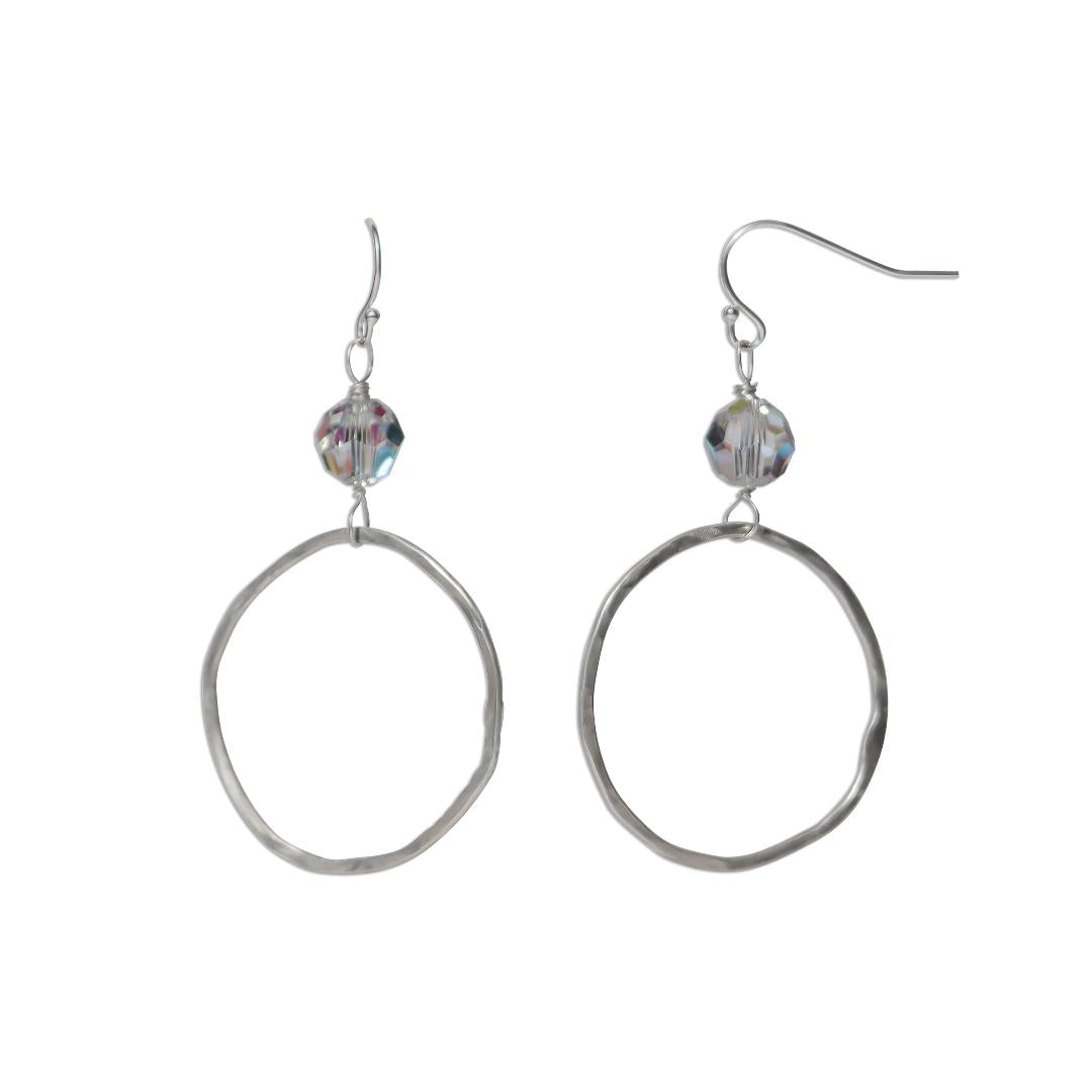 Silver dangle earrings featuring a sparkling clear Swarovski crystal that catches the light with every sway, paired with a hand-cut silver pendant for a unique, artisanal touch. The combination of shimmer and handcrafted detail creates a modern, elegant, and eye-catching piece.