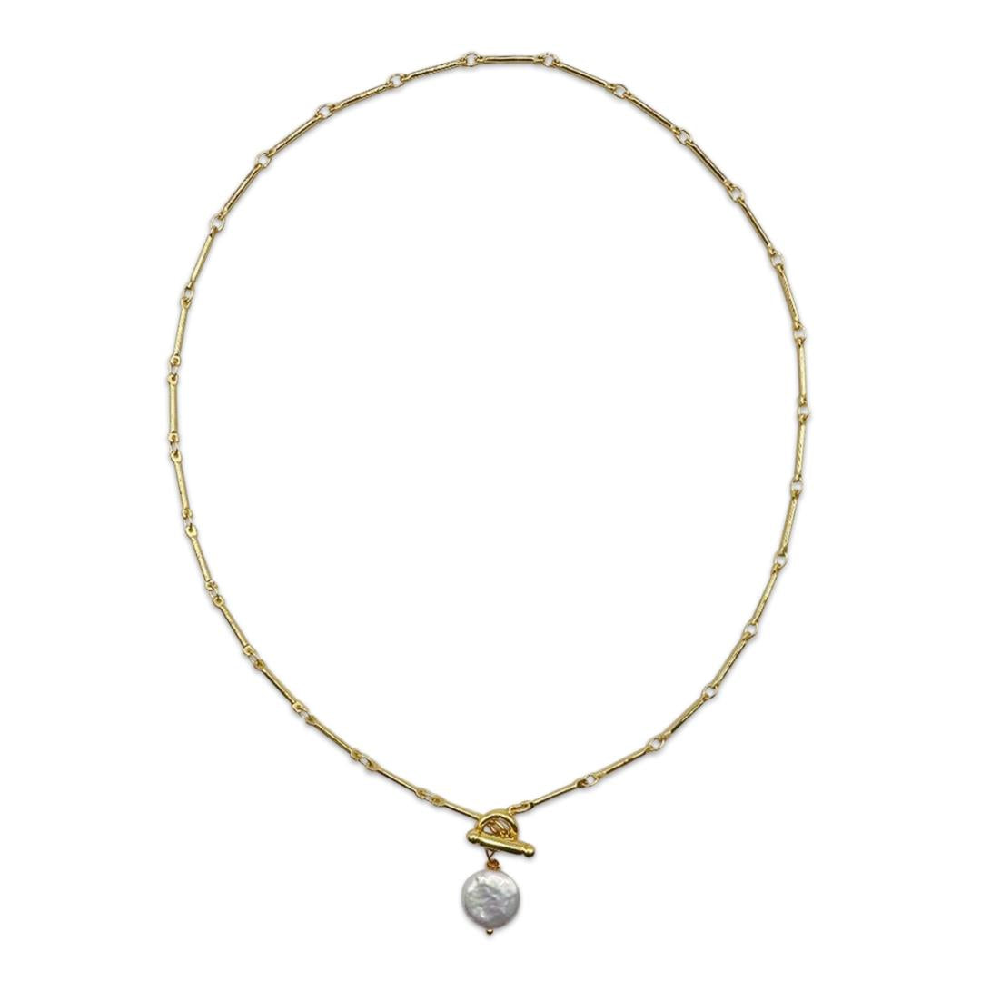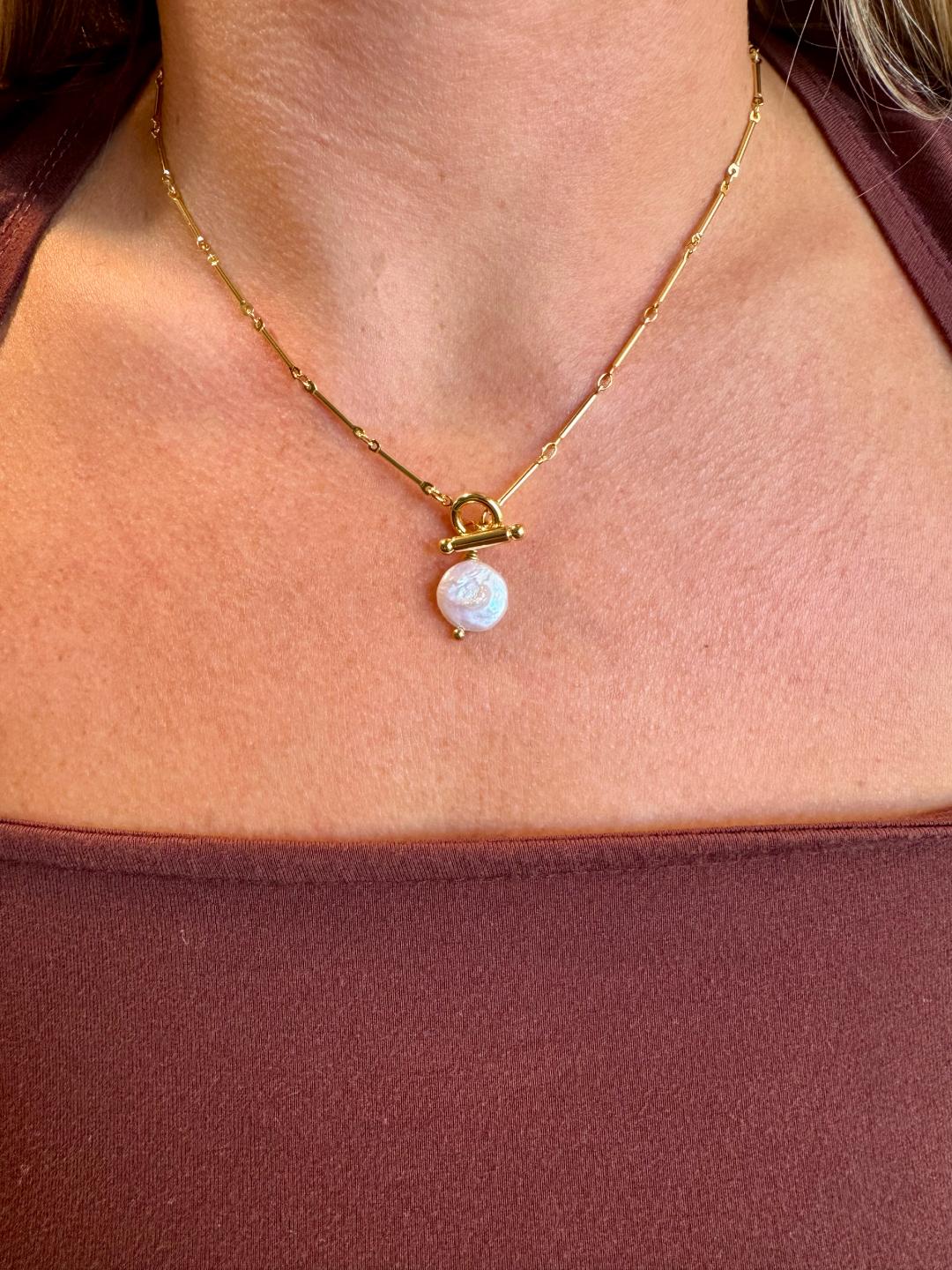A gold link chain with a charming front toggle that shows off a dangling coin pearl, giving the whole piece a fun, flirty glow. The shiny links and the pearl’s soft shimmer create a lively little spotlight right at the neckline.