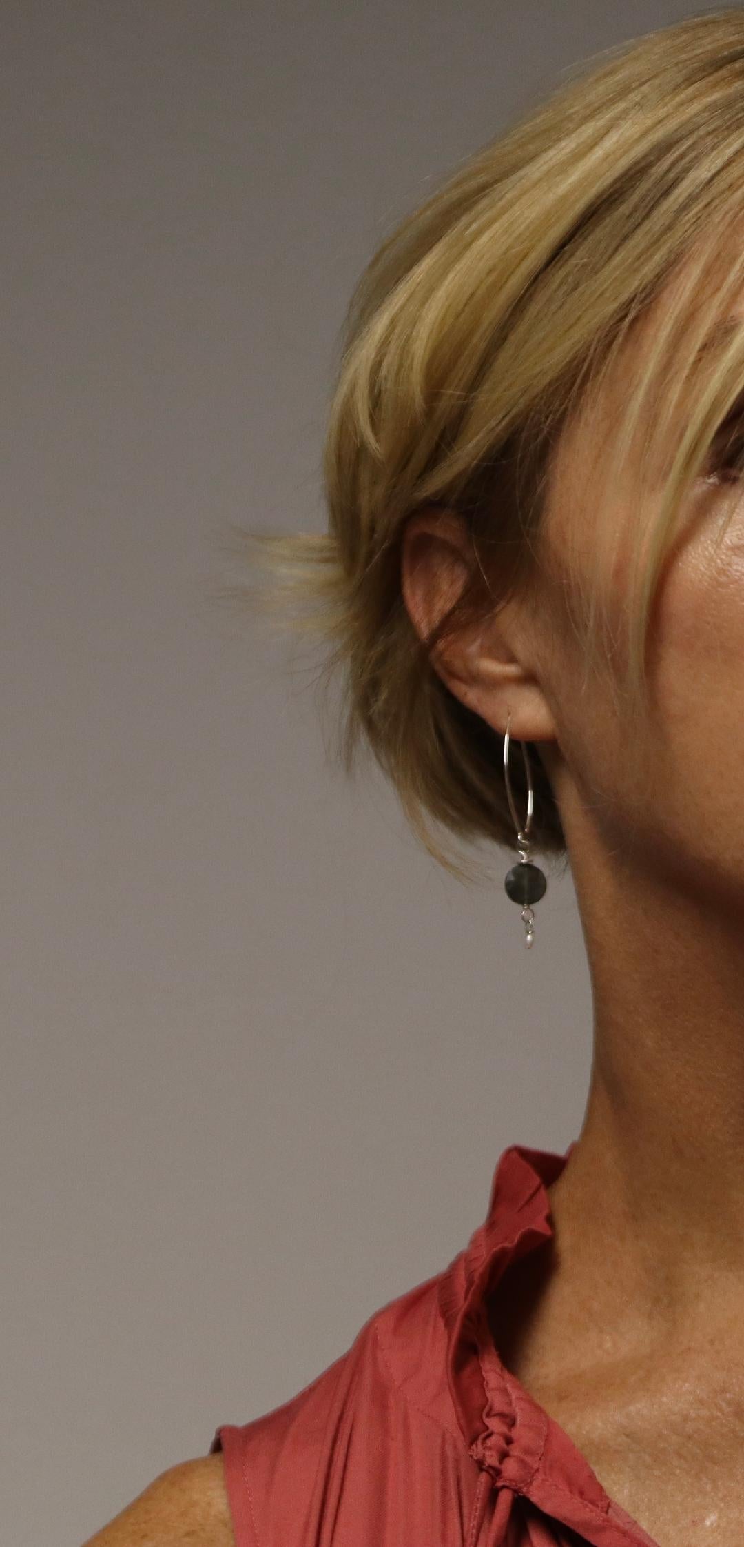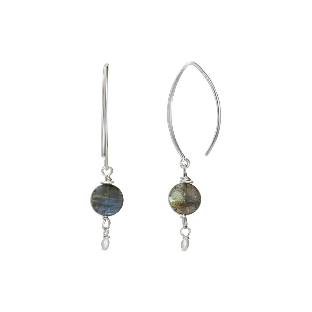 A delicate silver thread earring featuring a soft gray labradorite stone paired with a luminous freshwater pearl that dangles elegantly. The light, airy design creates subtle movement, making it a refined and versatile piece perfect for everyday wear.
