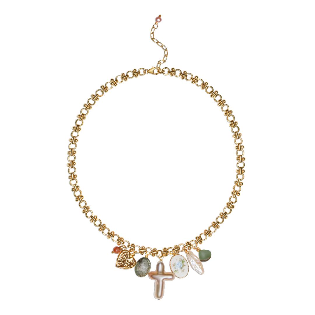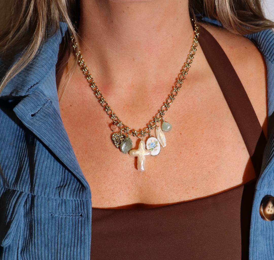 A curated mix of unique charms hangs from the center. Each charm adds its own character, creating a pendant cluster that feels personal, expressive, and timeless. Perfect for everyday wear or as a statement accessory for special occasions.