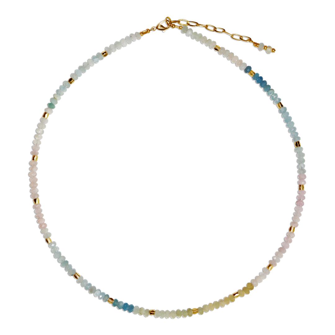 A delicate strand of natural morganite beads in a dreamy mix of pink, yellow, and powder blue. Soft, airy, and effortlessly feminine — a subtle splash of color you can wear every day.