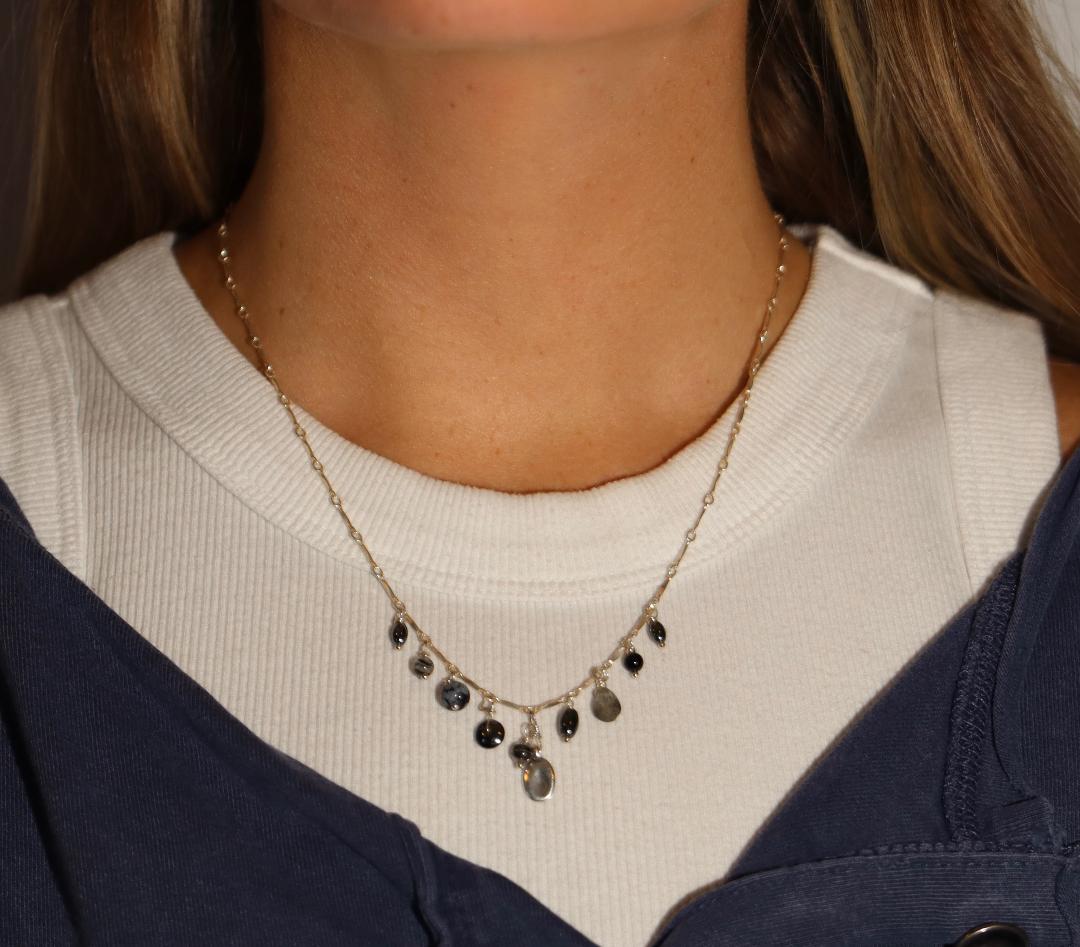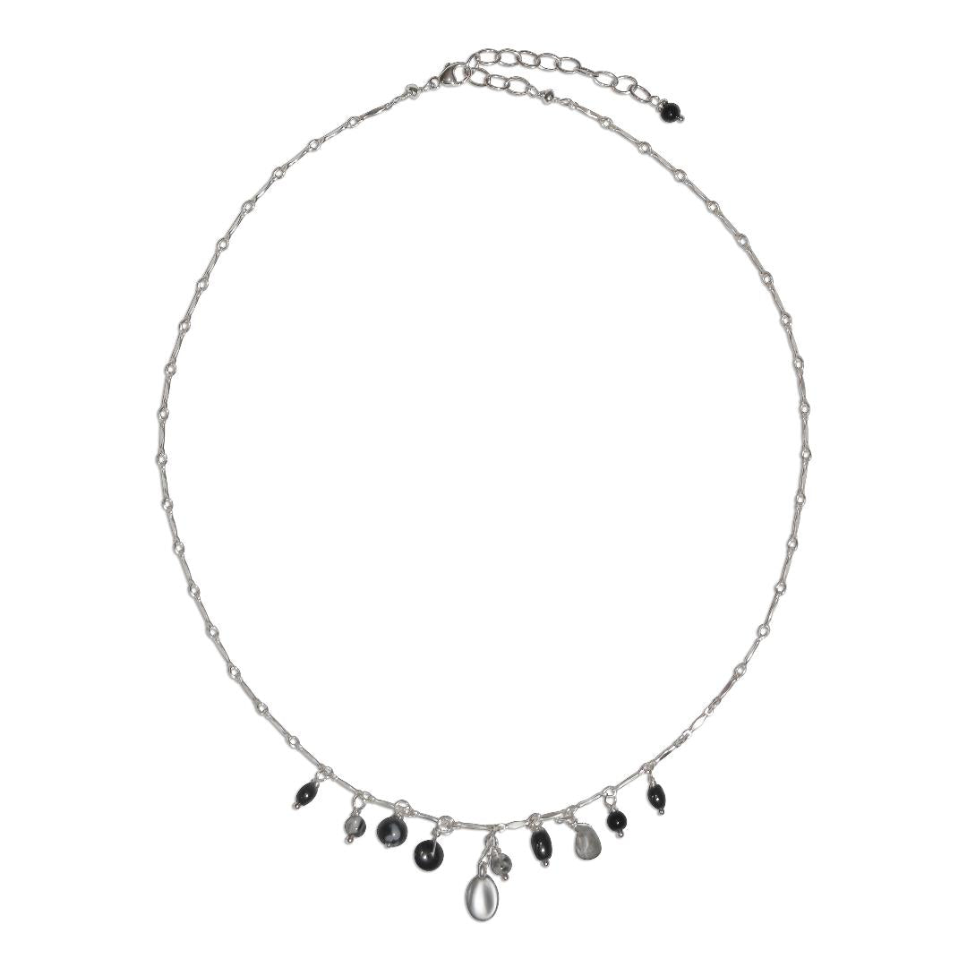 This necklace features a delicate silver chain accented with a row of tiny dangling charms in mixed finishes. The charms include sleek black teardrops, polished silver droplets, and a few tiny faceted beads, creating a subtle contrast of shine and depth. The overall look is minimal, modern, and slightly edgy, with a light, fluid movement as the charms hang and sway.