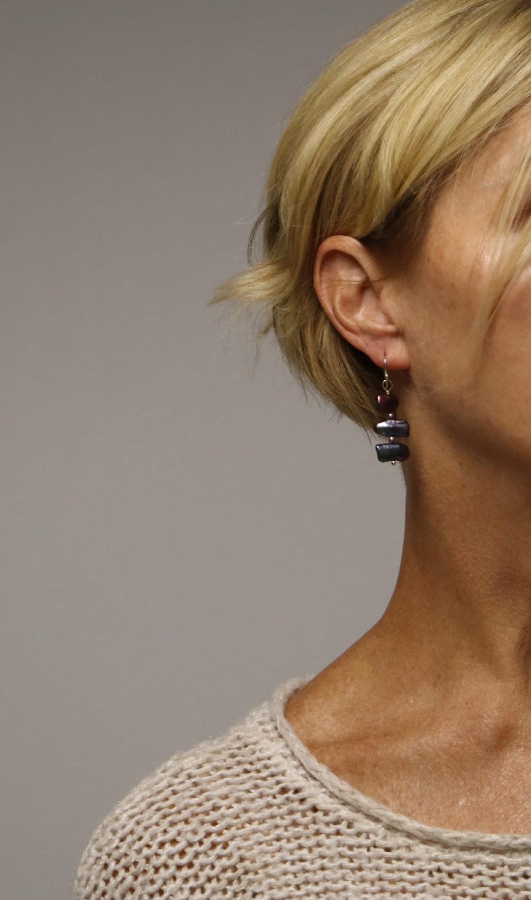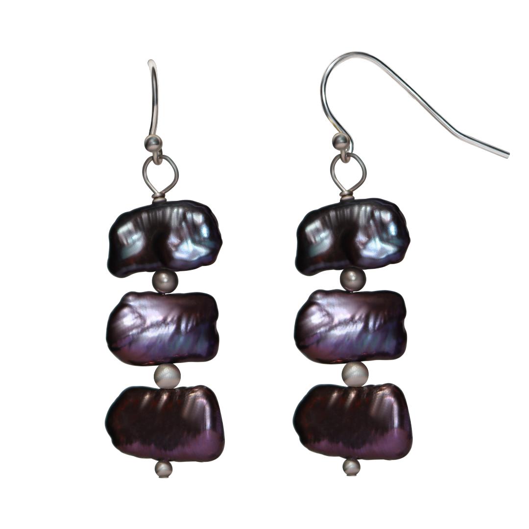 Silver dangle earrings showcasing three irregular purple freshwater pearls stacked and separated by tiny silver beads. The organic shapes and rich purple hues create a unique, playful design with subtle movement, making this piece both elegant and eye-catching.