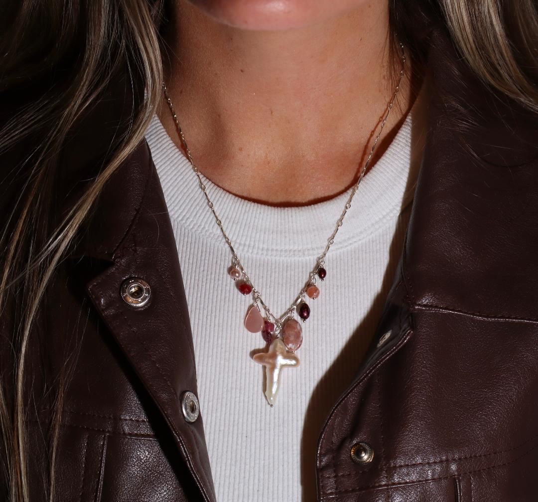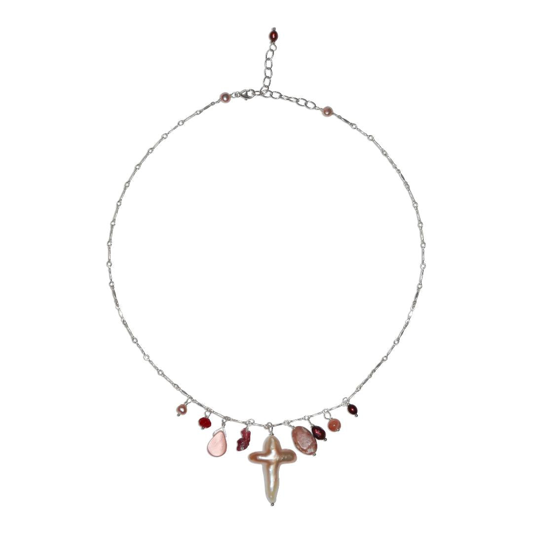 A delicate silver-toned chain is sprinkled with small rosy and burgundy beads, leading to a playful lineup of charms at the center. Each charm is unique—shimmery pink shell pieces, deep red stones, and the star of the show: a one-of-a-kind baroque pearl in an organic cross-like shape.