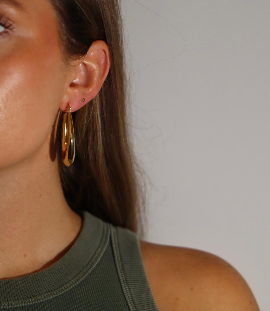 Elevate your look with these modern sculpted gold teardrop hoop earrings. Designed with a sleek, fluid silhouette, each earring features a gently tapered teardrop shape that widens at the base, creating a bold yet elegant profile. The high-polish gold finish adds a luxurious shine, making them perfect for both everyday wear and special occasions.