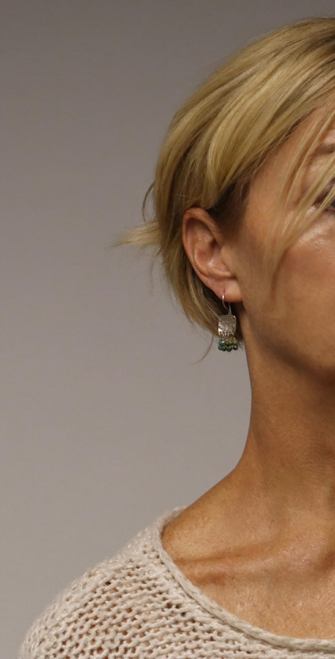 These elegant chandelier earrings blend understated sophistication with natural beauty. Each piece begins with a sterling silver cap, hand textured for subtle depth. Suspended beneath are clusters of hand selected gemstone beads in varying shades of teal, sea-foam green, turquoise, and warm amber, each faceted to capture and reflect light with every movement.