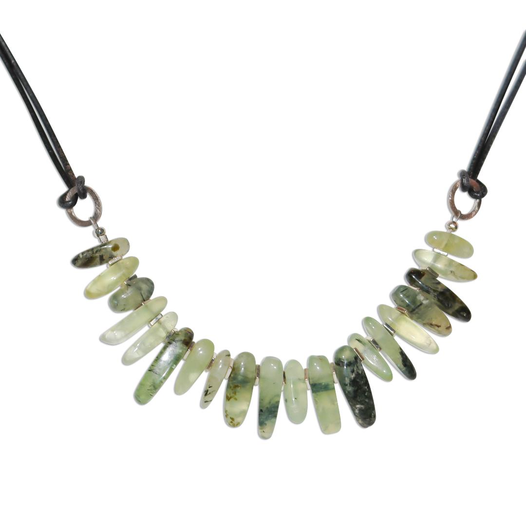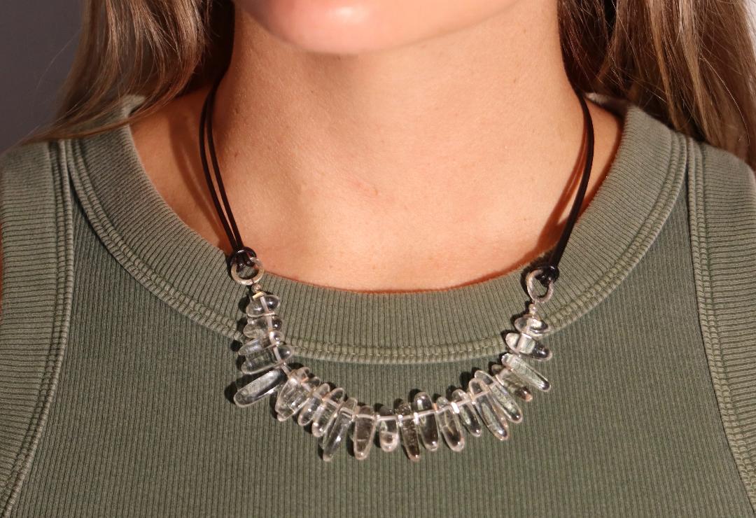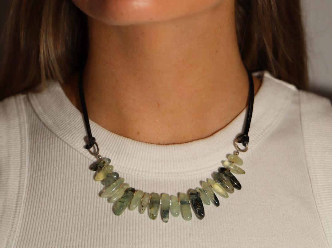 Add some fun to your style with this handcrafted necklace featuring polished green or clear stone slices. Each stone is uniquely shaped and showcases beautiful variations in color—from soft translucent greens to deeper mossy tones with organic inclusions. The stones are arranged in a graduated fan layout, creating a striking statement look.
